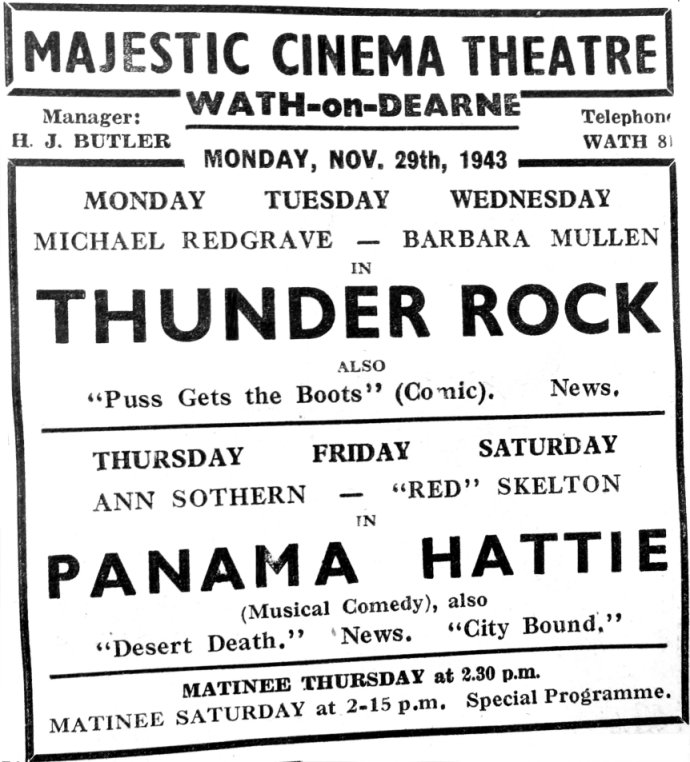 Cinemas Cinema – Majestic – Thunder Rock November 1943 South Yorkshire Times – November 27th, 1943 From YouTube:
