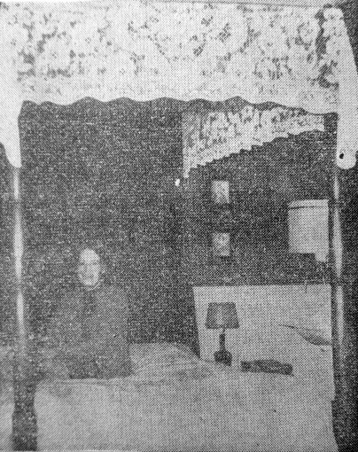 Mrs. Sally Dearnly, of Sandygate, Wath, sits on the four-poster bed her husband, John, Deputy Clerk to Wath Urban Council has made.