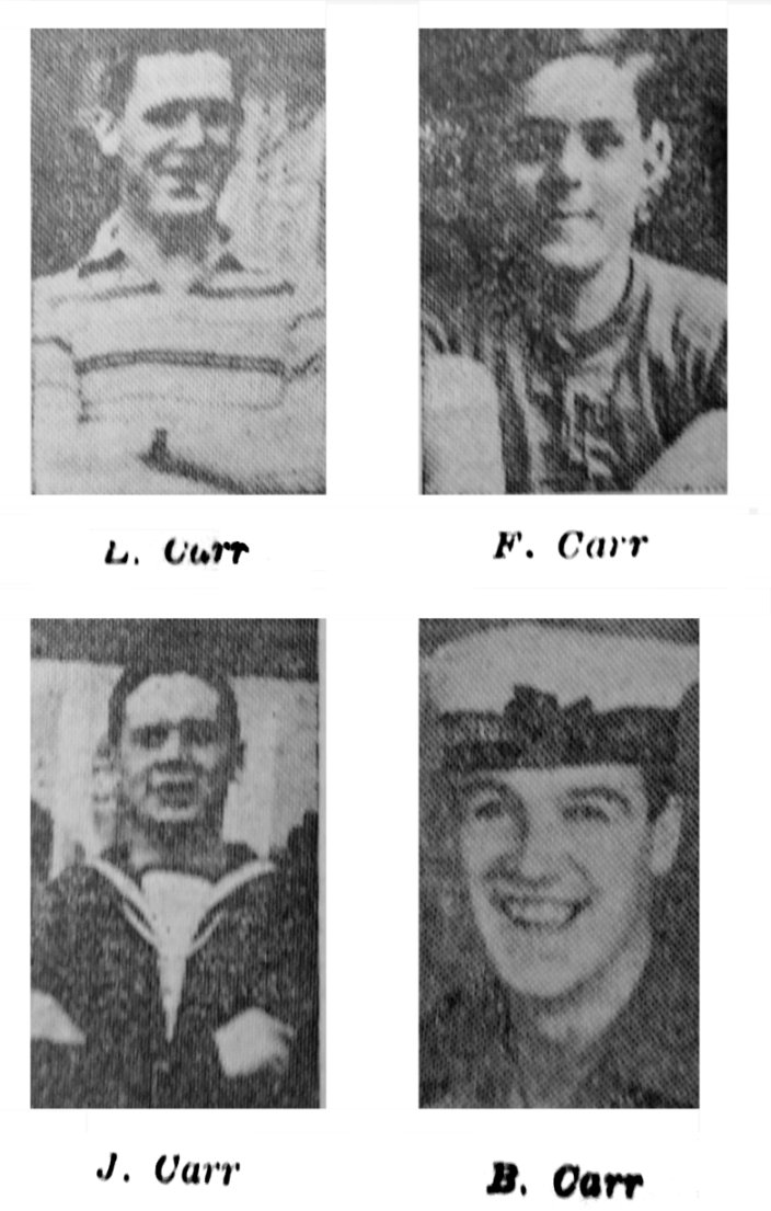All are in some branch of H.M. Forces, Battery Sergt. Major L. Carr and his brother Francis in the Army, John and Bernard in the Navy, and Douglas in the R.A.F.